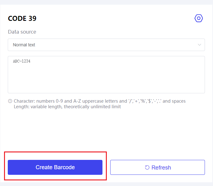 Next, you will need to enter the data that you want to encode in the barcode. This can be numbers 0-9 and A-Z uppercase letters and '/','+','%','$','-','.' and spaces that you want to be able to scan and decode later.